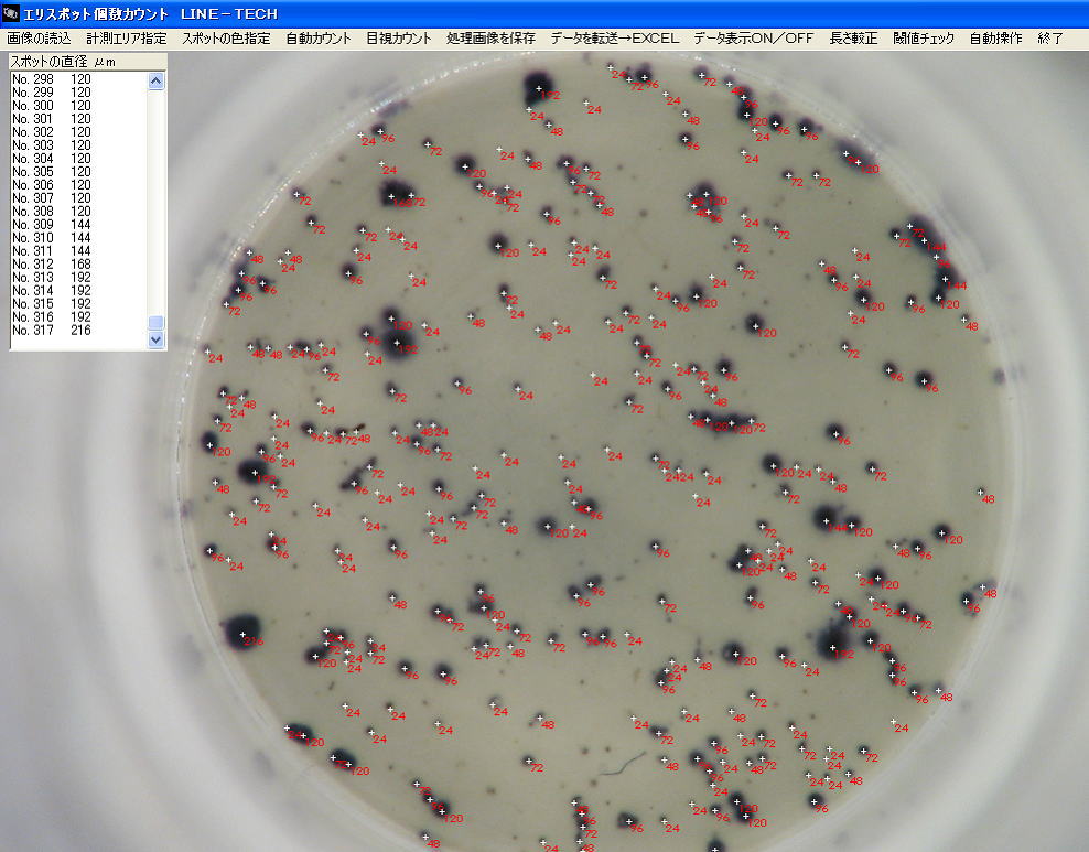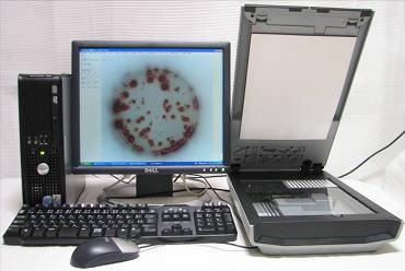 96ウェルプレートの底部メンブレンをシートに移し、それを専用スキャナーで全ウェル画像を取り込み、その画像を各ウェル毎にスポットカウント測定解析を行う。